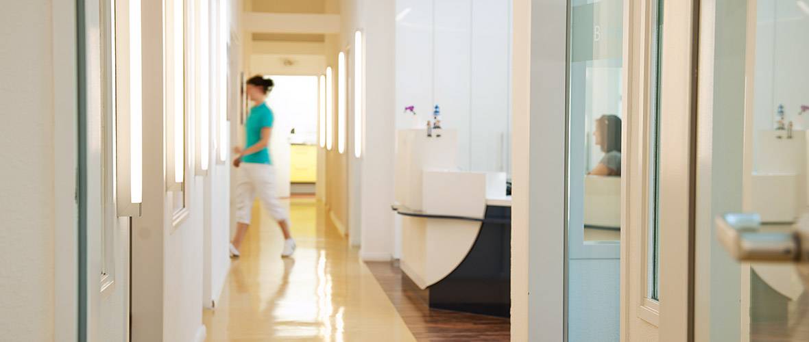 Die maritim eingerichtete Praxis liegt in einem ausgebauten Dachgeschoss, die Räume sind daher hell und freundlich und bieten eine Atmosphäre zum Wohlfühlen. Die Behandlungsräume sind modern und kinderfreundlich ausgestattet, ein großzügiges Lesezimmer mit Strandkorb und Kinderecke überbrücken die kurze Wartezeit bis zum Behandlungsbeginn. Von Anfang an eine heiß begehrte Attraktion bei Kindern ist der bunte Dino-Behandlungsstuhl.